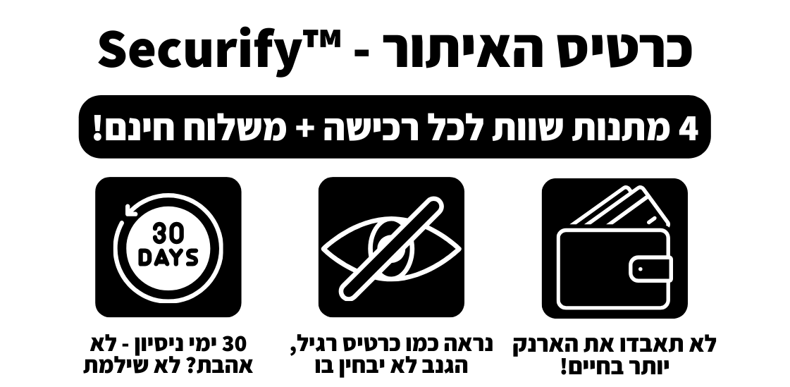 כל תשלום מתבצע דרך חברות הסליקה הבטוחות והמוכרות בישראל.